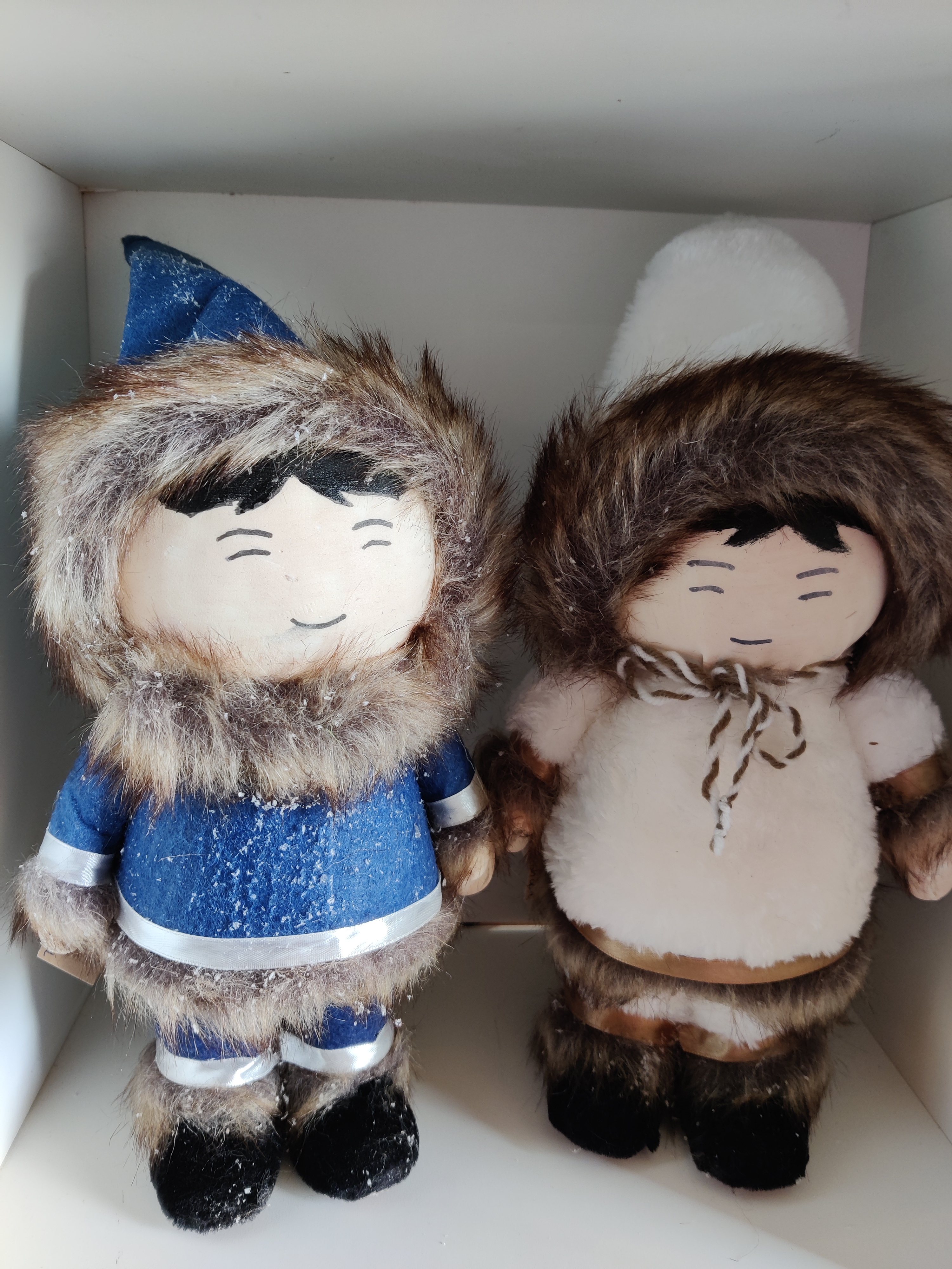 Setje van een eskimo jongen blauw vilten pakje en een eskimo meisje in een wit vilten pak