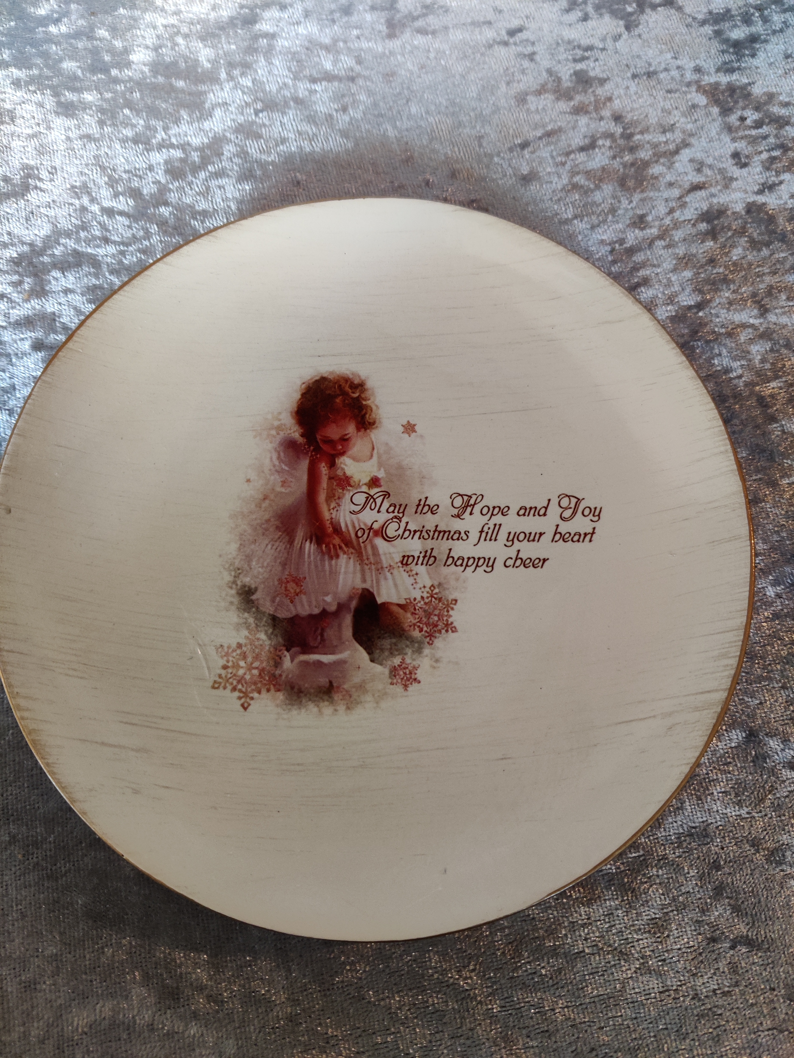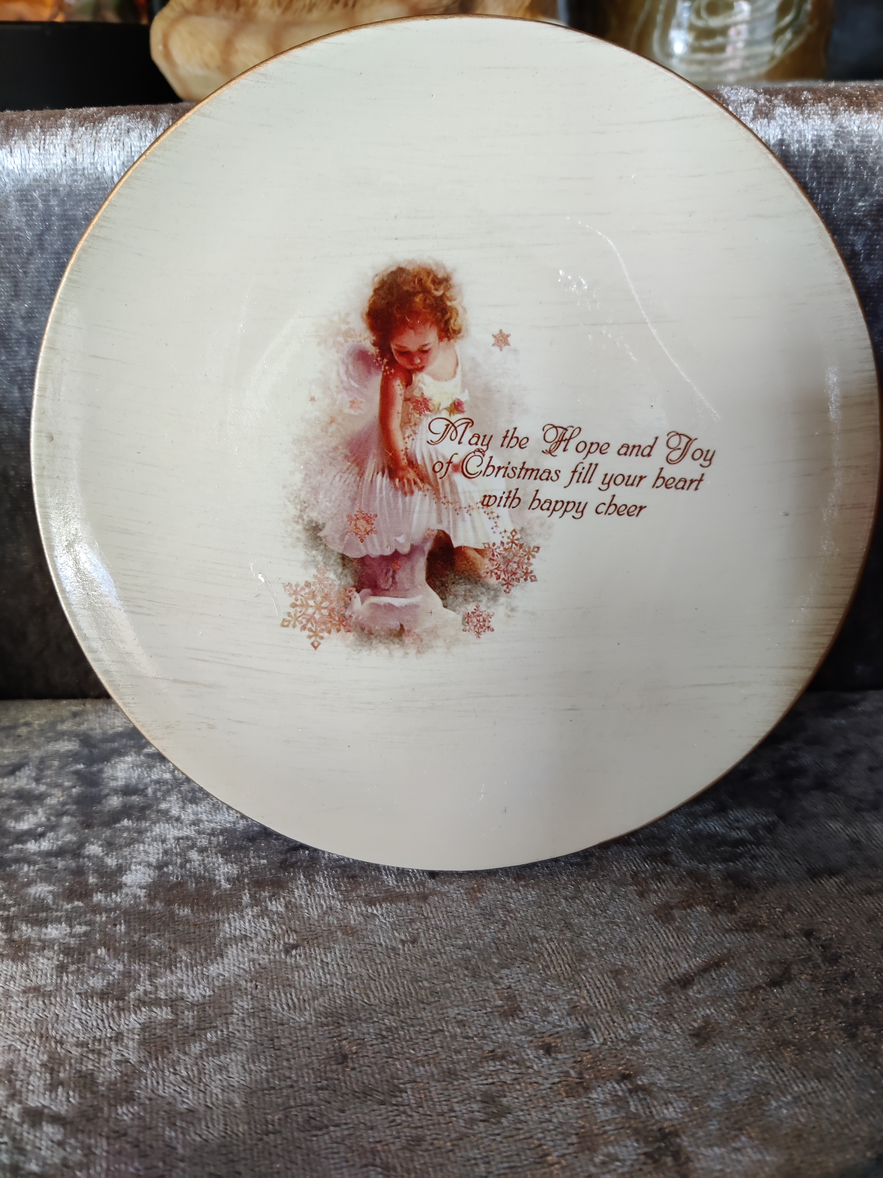 Op de schotel staat een engelachtig meisje en de volgende tekst